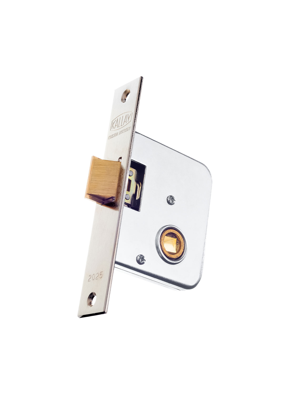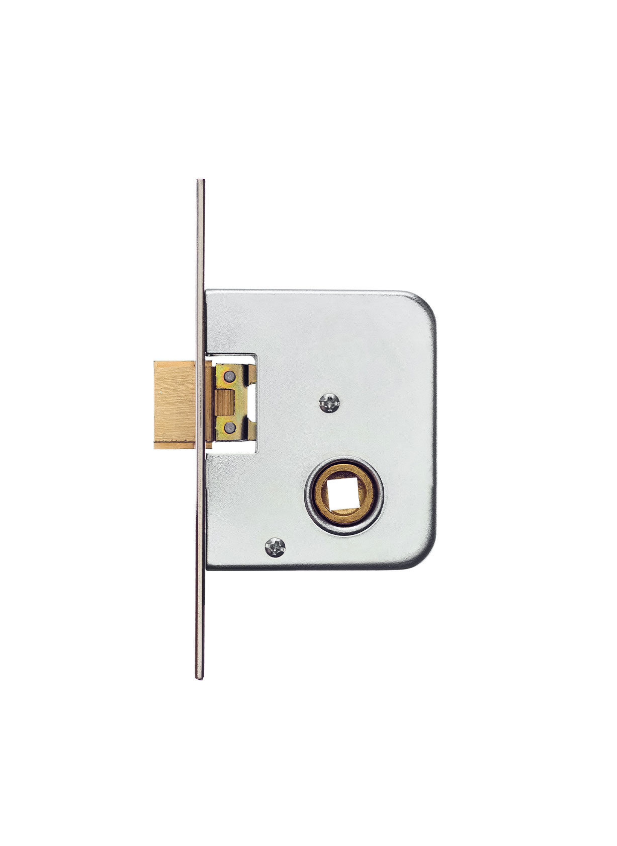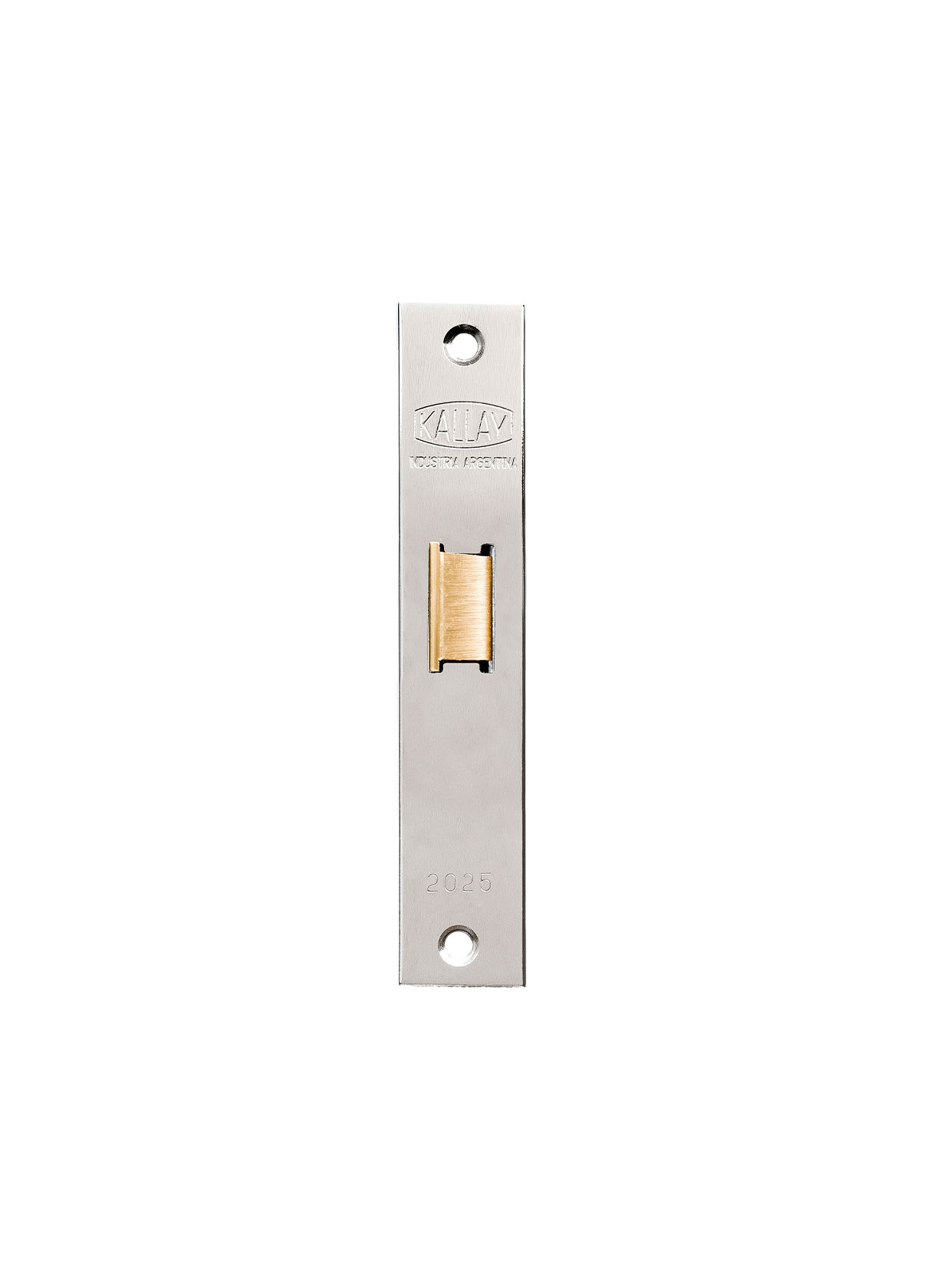 Pestillo entero o partido de bronce trefilado.Caja y piezas interiores con protección galvánica de zinc electrolítico. Sin llave para colocar manija. Para embutir.